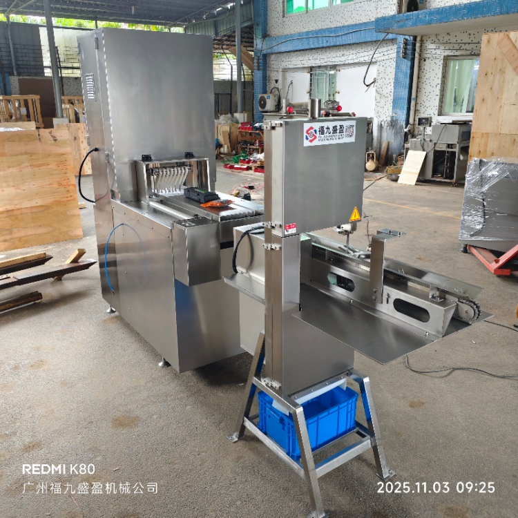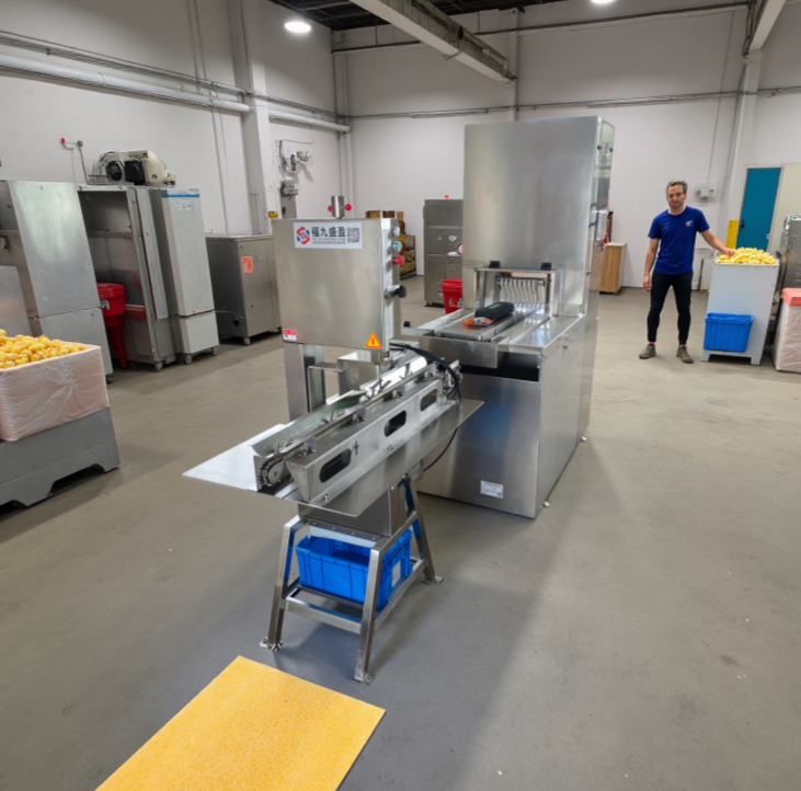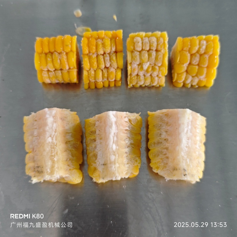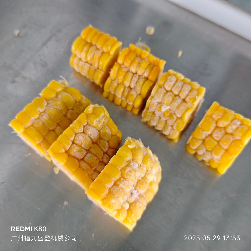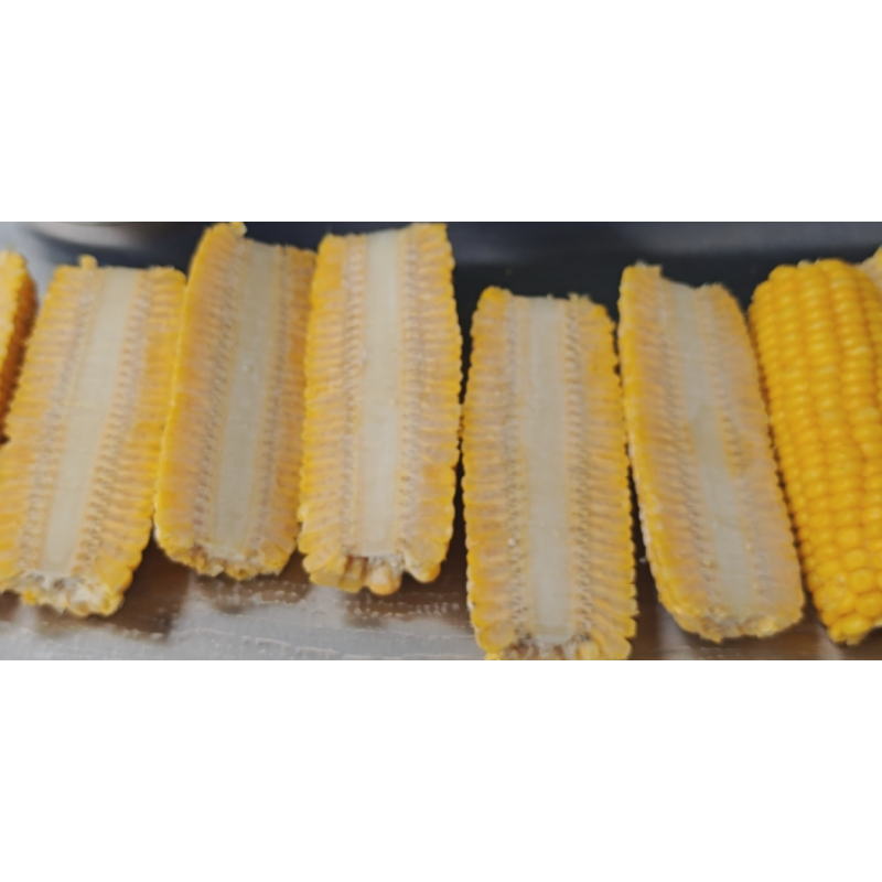 玉米分瓣切段生產線設備,是由廣州福九盛盈機械和九盈機械聯合設計開發制造,主要用于冷凍玉米、新鮮玉米、木薯、蓮藕等食材居中分半切切段加工,具有分半均勻、連續投料生產,高效安全、易于操作、切面光滑、切面整齊、不掉粒、無碎渣、每分鐘生產30-40穗,一級玉米、雜玉米都可應用,分兩半及分四瓣。結合多段鋸玉米切段機可連續生產加工玉米段;玉米塊等成品食材。特別適用于大型玉米加工廠、冷凍食材供應鏈企業、中央廚房配餐中心應用。