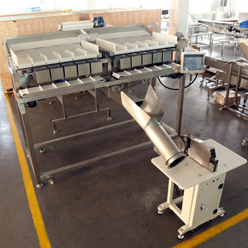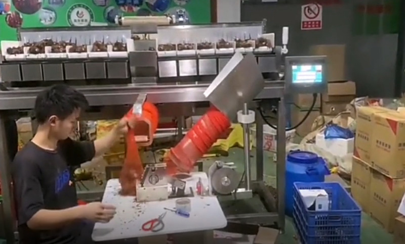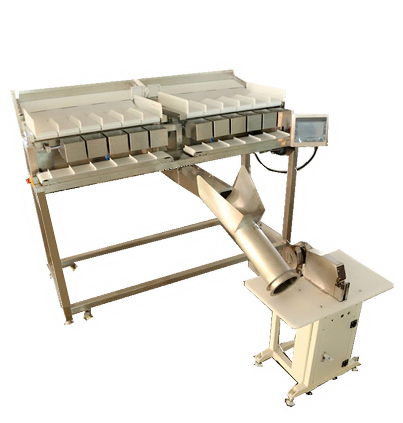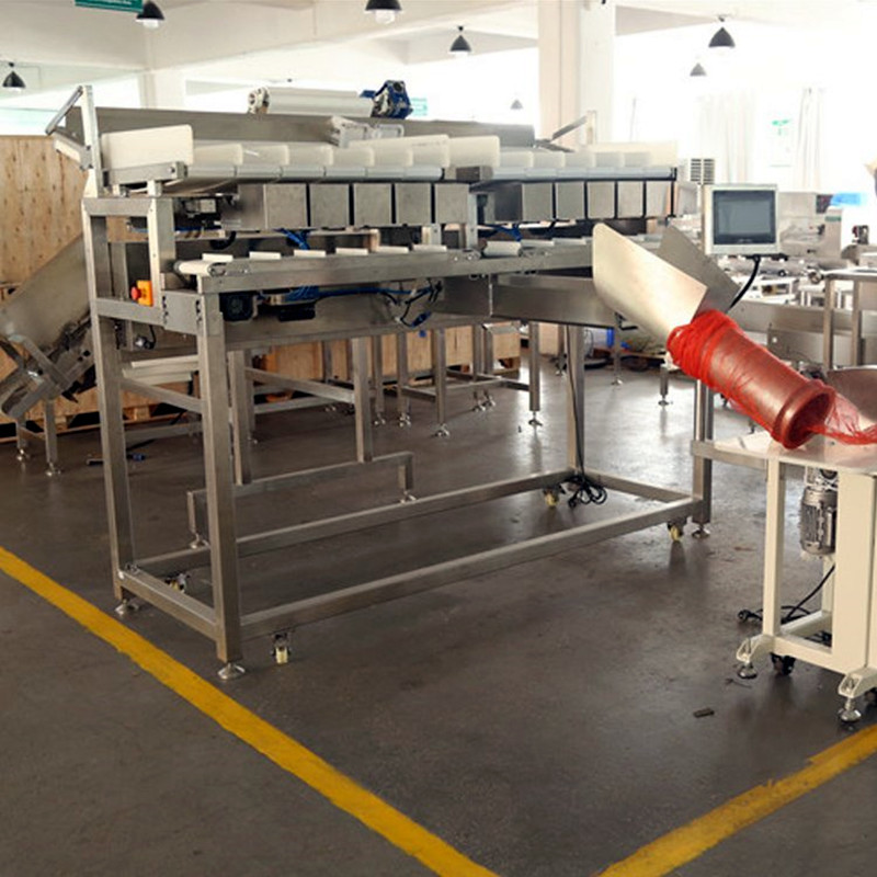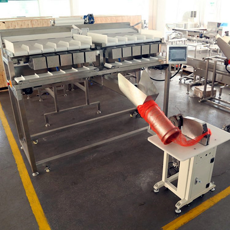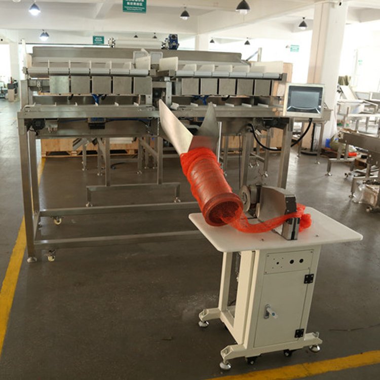 · 人工將物料放入料斗中,傳送至挑選皮帶輸送機上,人工可自行挑選爛果等,提升機將物料傳送至網兜打釘機上,物料將自行滾落至各稱臺中配重,符合目標重量合適組合會自動下落至網兜打釘機中包裝。